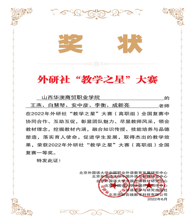 近日,2022年外研社“教学之星”大赛(高职组)落下帷幕。我院外语系王燕、白慧琴、安中彦、李衡、成新亮参赛团队凭借出色的表现获全国复赛一等奖。