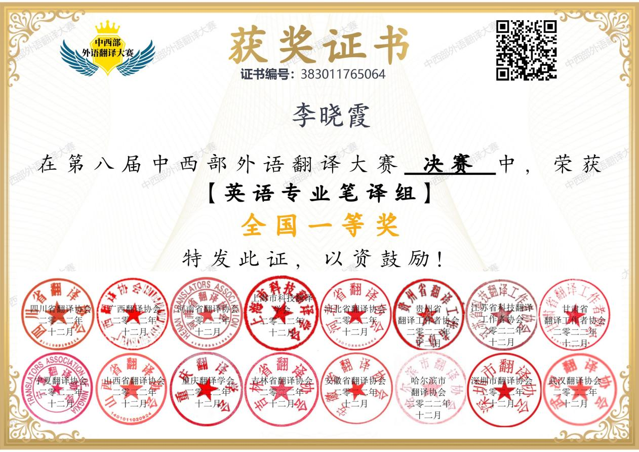 近日,第八届中西部外语翻译大赛公布了全国决赛获奖名单,我系教师李晓霞在英语专业笔译组中取得了全国一等奖的佳绩。