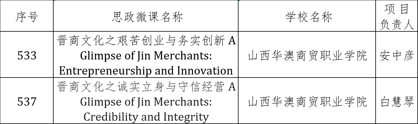 近日,山西省教育厅公布了山西省职业教育铸魂育人计划项目2022年度认定结果。根据《山西省教育厅 山西省人力资源和社会保障厅关于做好2022年度山西省职业教育铸魂育人计划项目认定工作的通知》(晋教职成函〔2022〕86号)要求,省教育厅和省人社厅分别对所属职业院校申报项目组织专家审核认定,经过网站公示、异议处置等程序,我系微课作品《晋商文化之艰苦创业与务实创新 A Glimpse of Jin Merchants: Entrepreneurship and Innovation》和《晋商文化之诚实立身与守信经营 A Glimpse of Jin Merchants: Credibility and Integrity》获得思政微课项目认定。
