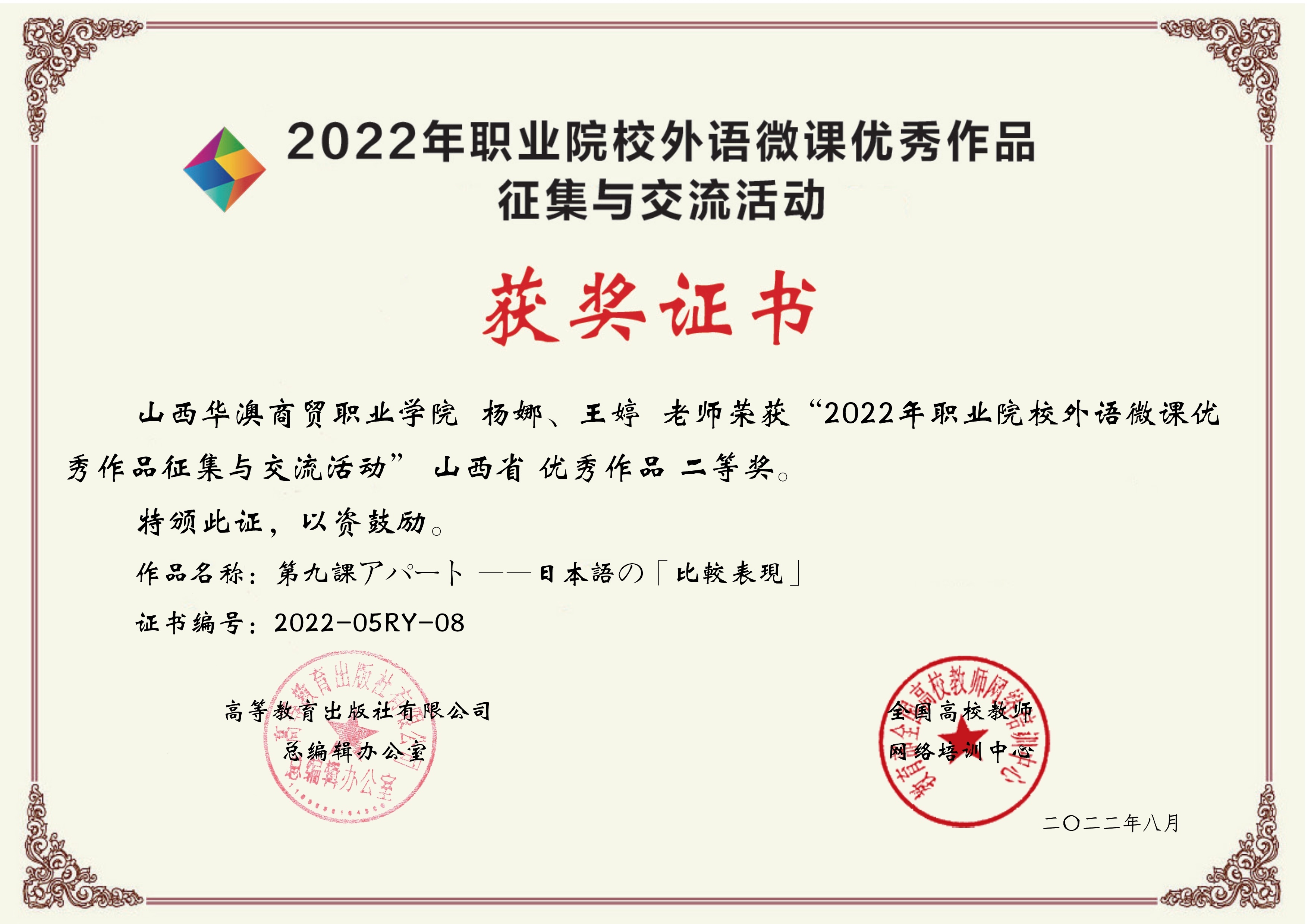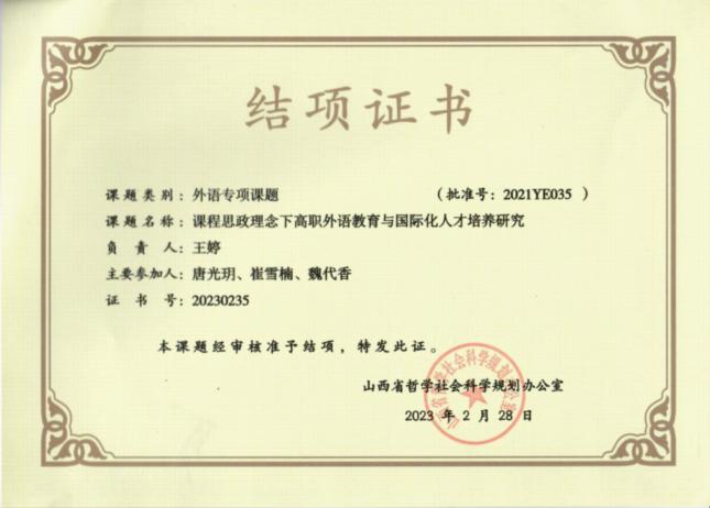 一、教学工作,兢兢业业。教学上,她教书育人,为人师表,思考的是如何提高日语教学质量,培养出具有国际化视野的人才。在平时的教学中,博采众长,广泛搜集相关资料,精心组织教学活动,巧妙设计教学环节,探索新的教学方法,并大胆地将心理学游戏应用到日语教学中,从而大大提高了学生学习日语的兴趣。同时,坚持以赛促教、以赛促改,积极组织商务日语专业学生参加各类技能大赛,旨在提高技能竞赛与日常教学的良性互动,推动日语教学内容和方式方法的变革,进而提升专业人才培养的质量。2018年指导学生参加“建行杯”第四届山西省互联网+大学生创新创业大赛,获得了三等奖。2021年指导学生参加“人民中国杯”日语国际翻译大赛和“亿学杯”全国大学生日语词汇及综合能力大赛并获奖。