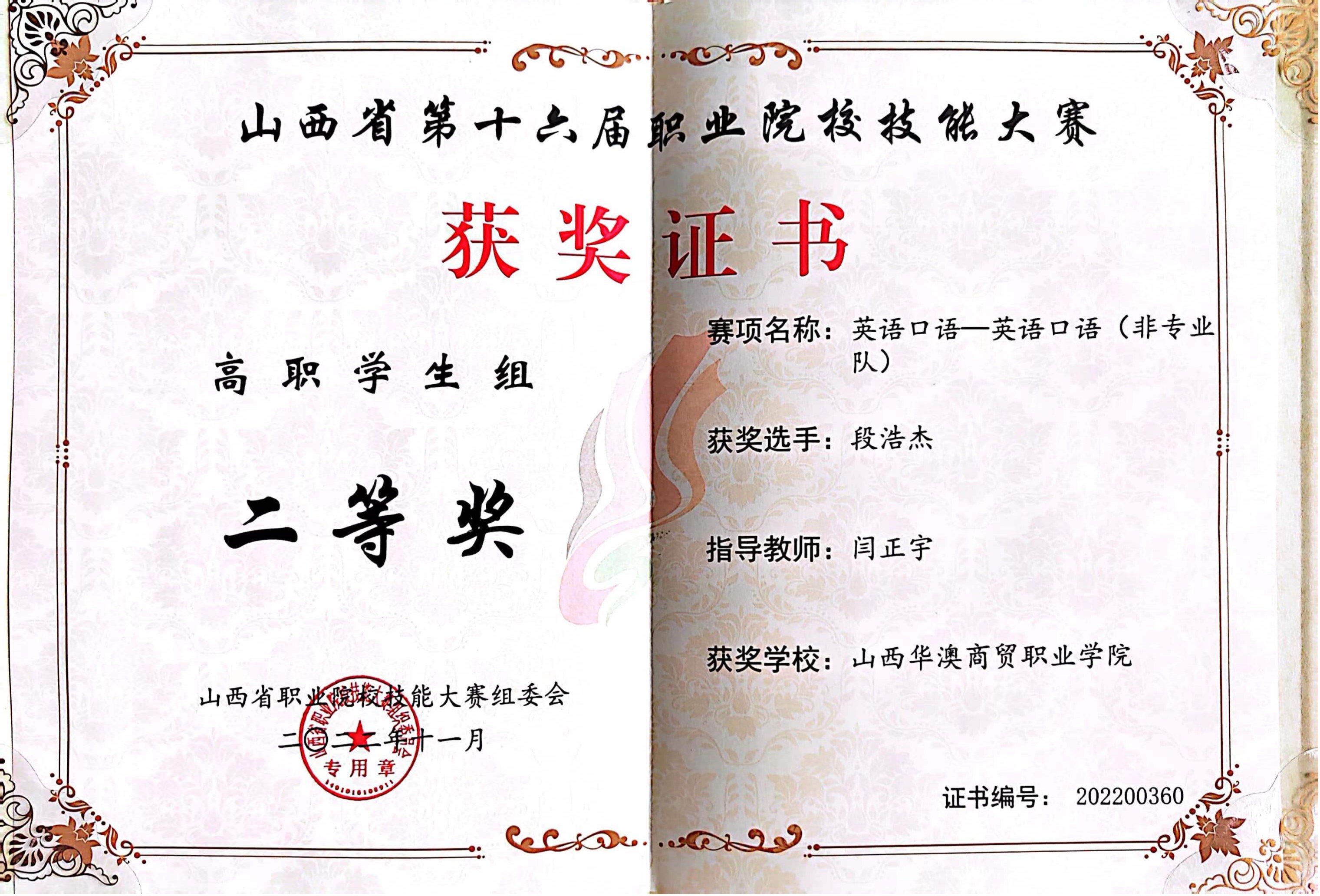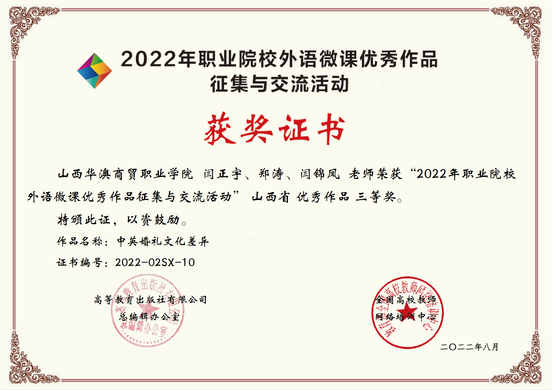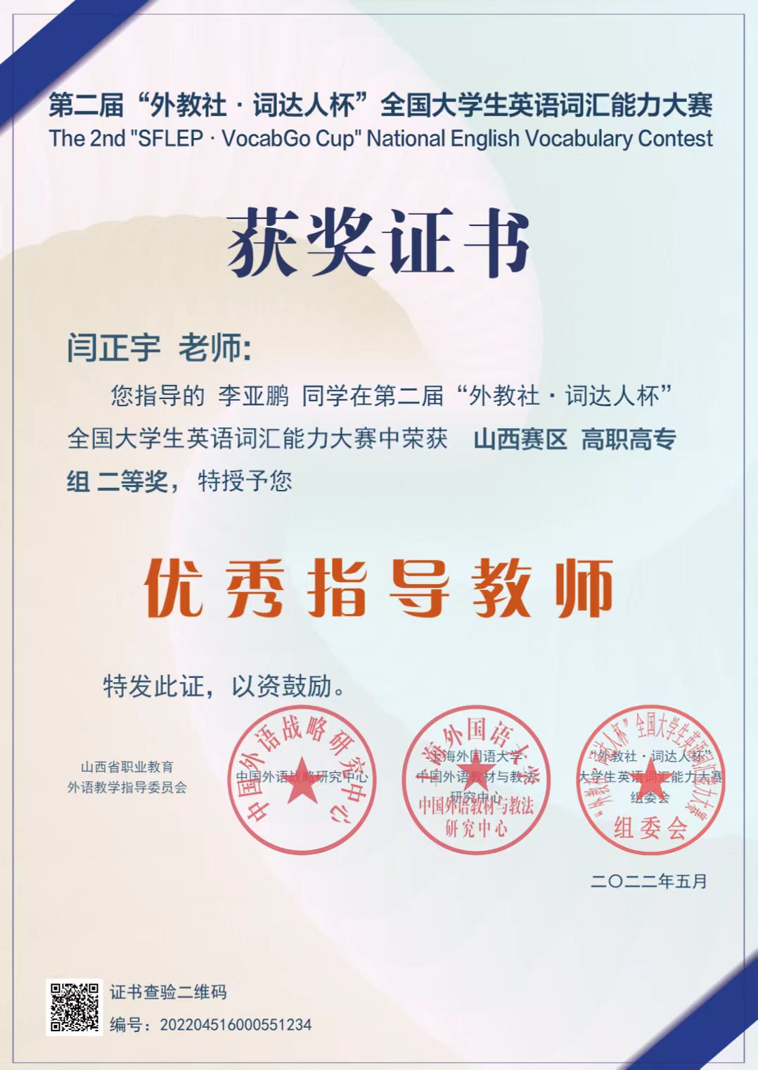 从教以来,闫老师先后获得多项教学荣誉。连续两年获得“外教社·词达人杯”全国大学生英语词汇能力大赛优秀指导教师奖;在2022年“职业院校外语课程思政优秀教学案例征集与交流活动”中荣获山西省一等奖;2022年指导学生参加山西省第十六届职业院校技能大赛英语口语大赛荣获二等奖。