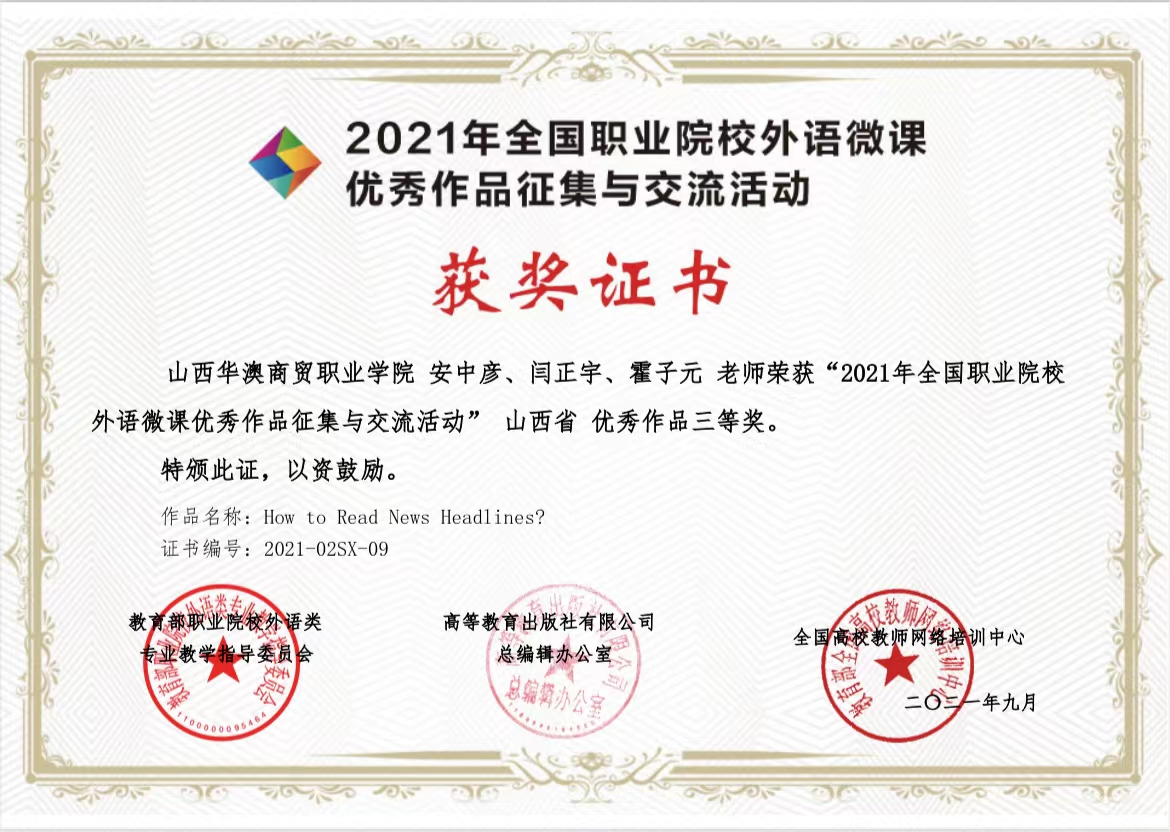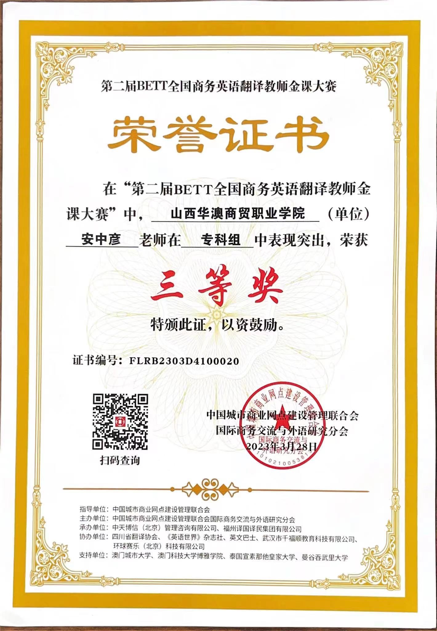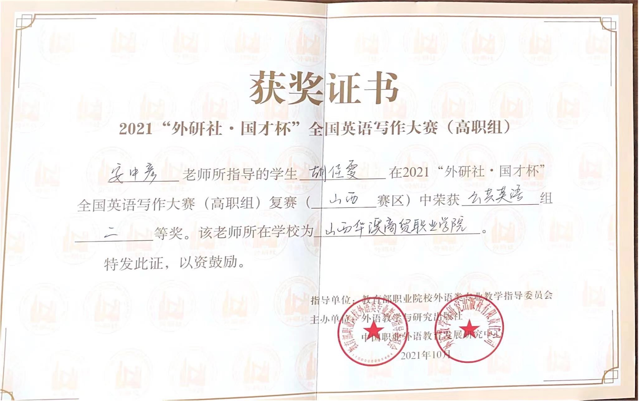 安中彦老师长期坚持教学一线工作,兢兢业业,德才兼备,深受广大学生们的尊敬与爱戴。她潜心教学科研,积极参加学校举办的各种赛事及活动。2020年参与课题“课程思政视域下高职英语教学中本土优秀文化渗透的探索与实践——以晋商文化品牌为例”;2022年其作品《晋商文化之艰苦创业与务实创新》获得山西省职业教育铸魂育人计划项目认定。她在致力于自身专业发展的同时,还用热情和智慧引导学生的发展。在教学中,她认真钻研教材,大量补充教学材料,坚持业务自学,不断改革和借鉴优秀的教学方法,提高自己的教学能力,优化教学课堂。此外,她还坚持以赛促学、以赛促教的教学理念鼓励学生积极参加各种赛事,提倡学生在实践中认识自己、了解自己、发现自己,从而不断地提高自己,完善自己。