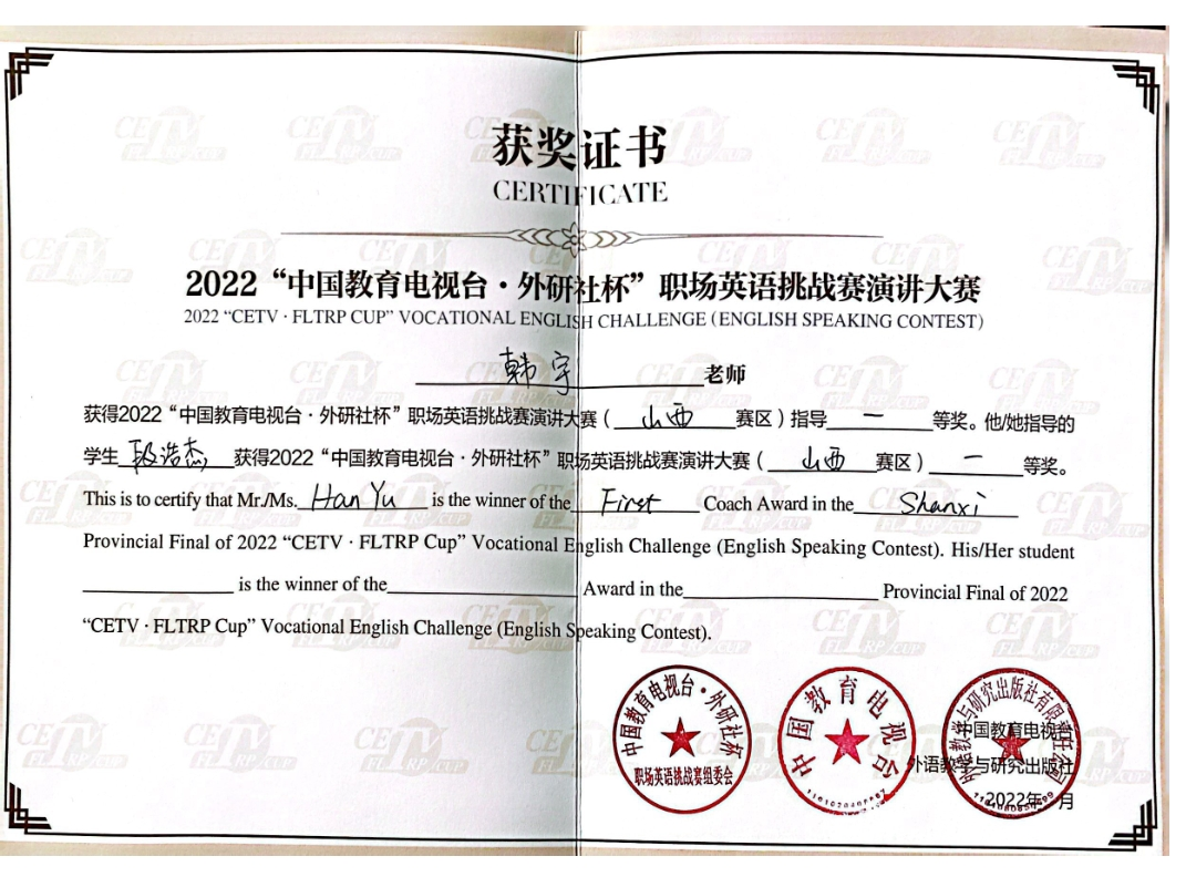 韩宇老师通过赛事指导,积极改进教学内容,优化教学方法,培养学生对英语学习的兴趣与动机,让学生主动积极地投入到英语学习中去,真正为培养适应社会发展要求的高素质技能型人才服务。韩宇老师指导学生参加2022“中国教育电视台·外研社杯”职场英语挑战演讲大赛(山西赛区)中荣获一等奖。