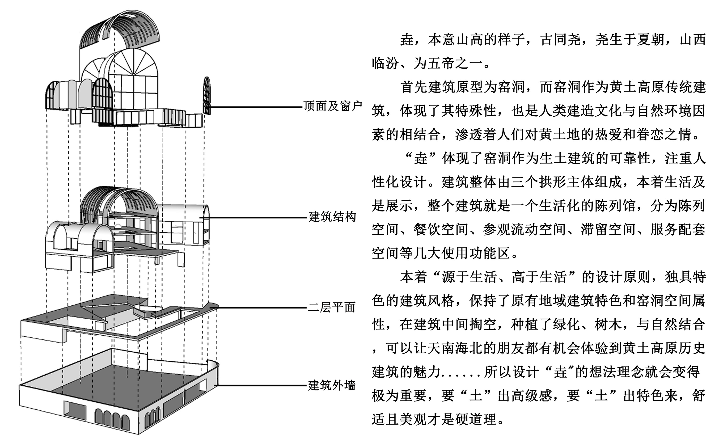 “垚”体现了窑洞作为生土建筑的可靠性,注重人性化设计。建筑整体由三个拱形主体组成,本着生活及是展示,整个建筑就是一个生活化的陈列馆,分为陈列空间、餐饮空间、参观流动空间、滞留空间、服务配套空间等几大使用功能区。