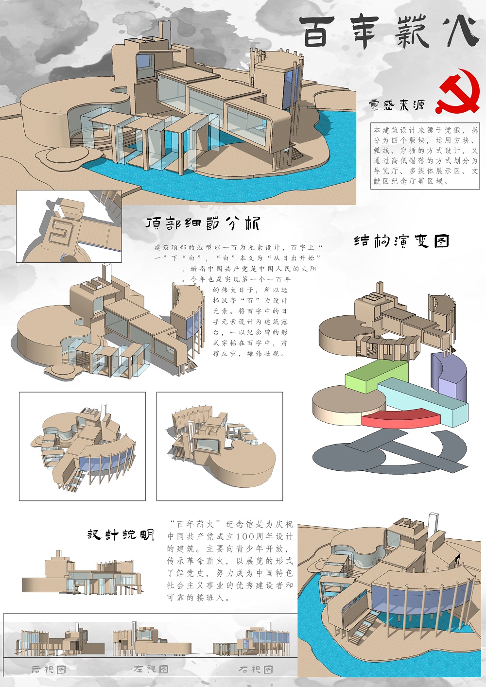 该作品由艺术系建筑室内设计1906班梁俊英同学创作,作者希望通过本方案激励新时代的我们要不忘初心、砥砺前行,用永不褪色地激情在未来的道路上披荆斩棘、不懈奋斗!