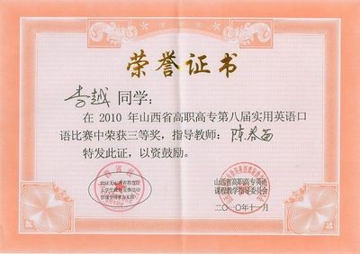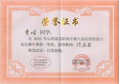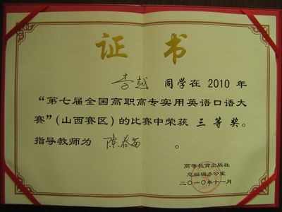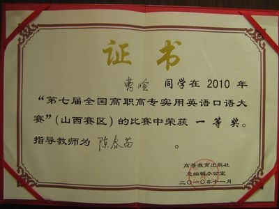 2010年11月20日我院09级商务英语专业学生曹暄、09级会计专业学生李越参加了山西省第八届高职高专实用英语口语演讲比赛(即第七届全国高职高专实用英语口语大赛(山西赛区)总决赛)。我院参赛选手沉着冷静、机智从容,以出色的表现分别获得了一等奖和三等奖。再一次展示了我院的外语实力,为我院增光添彩!