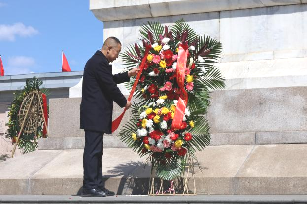 在刘胡兰烈士纪念碑前,全体同志整齐列队,向革命烈士敬献花篮,鞠躬默哀。刘国垠同志缓步上前,仔细整理花篮挽联。